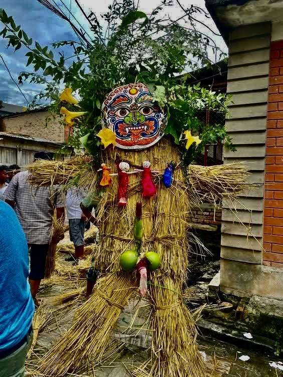 – बाँस वा पातले बनेका प्रतीक मूर्ति/झाँकी गल्लीमा घुमाएर इनाम दान गरिन्छ; नदिमा प्रवाह वा जलाएर जलाइन्छ ।