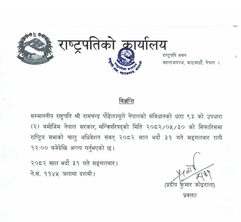 “सम्माननीय राष्ट्रपति श्री रामचन्द्र पौडेलज्यूले नेपालको संविधानको धारा ९३ को उपधारा (२) बमोजिम नेपाल सरकार, मन्त्रिपरिषद्को मिति २०८२/०५/३० को सिफारिसमा राष्ट्रिय सभाको चालु अधिवेशन संवत् २०८२ साल भदौ ३१ गते मङ्गलबार राति १२ः०० बजेदेखि अन्त्य गर्नुभएको छ।”