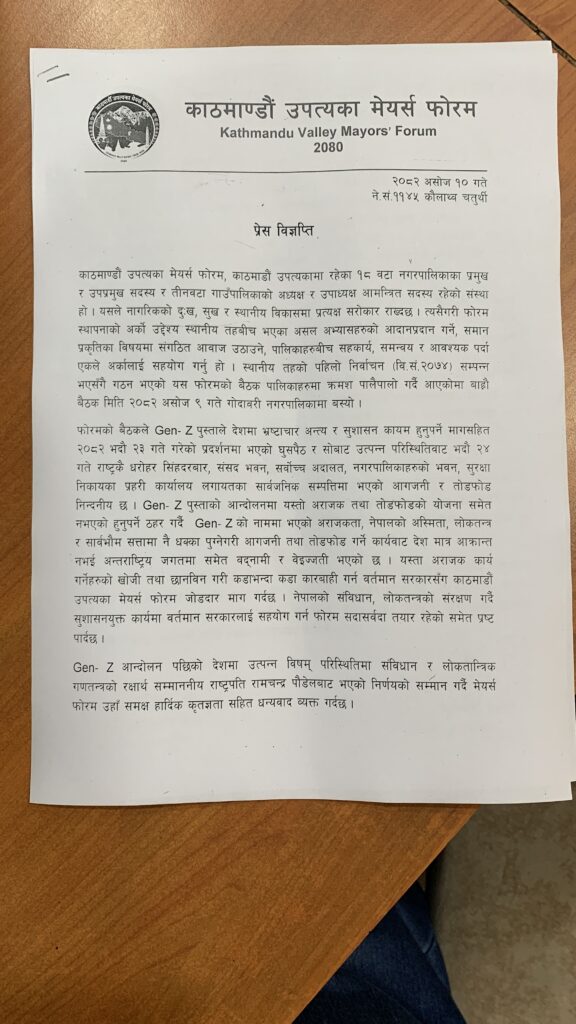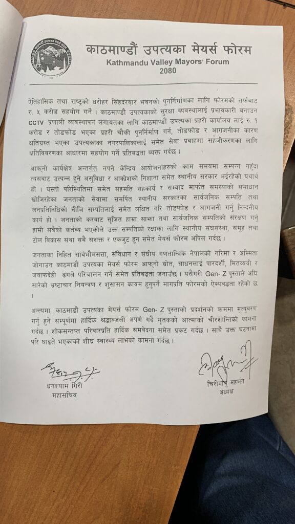 फोरमको बैठकले Gen- Z पुस्ताले देशमा भ्रष्टाचार अन्त्य र सुशासन कायम हुनुपर्ने मागसहित २०८२ भदौ २३ गते गरेको प्रदर्शनमा भएको घुसपैठ र सोबाट उत्पन्न परिस्थितिवाट भदौ २४ गते राष्ट्रकै धरोहर सिंहदरबार, संसद भवन, सर्वोच्च अदालत, नगरपालिकाहरुको भवन, सुरक्षा निकायका प्रहरी कार्यालय लगायतका सार्वजनिक सम्पत्तिमा भएको आगजनी र तोडफोड निन्दनीय छ । Gen Z पुस्ताको आन्दोलनमा यस्तो अराजक तथा तोडफोडको योजना समेत नभएको हुनुपर्ने ठहर गर्दै Gen- Z को नाममा भएको अराजकता, नेपालको अस्मिता, लोकतन्त्र र सार्वभौम सत्तामा नै धक्का पुग्नेगरी आगजनी तथा तोडफोड गर्ने कार्यवाट देश मात्र आक्रान्त नभई अन्तराष्ट्रिय जगतमा समेत वनामी र वेइज्जती भएको छ । यस्ता अराजक कार्य गर्नेहरुको खोजी तथा छानविन गरी कडाभन्दा कडा कारबाही गर्न वर्तमान सरकारसँग काठमाडौं उपत्यका मेयर्स फोरम जोडदार माग गर्दछ । नेपालको संविधान, लोकतन्त्रको संरक्षण गर्दै सुशासनयुक्त कार्यमा वर्तमान सरकारलाई सहयोग गर्न फोरम सदासर्वदा तयार रहेको समेत प्रष्ट पार्दछ ।